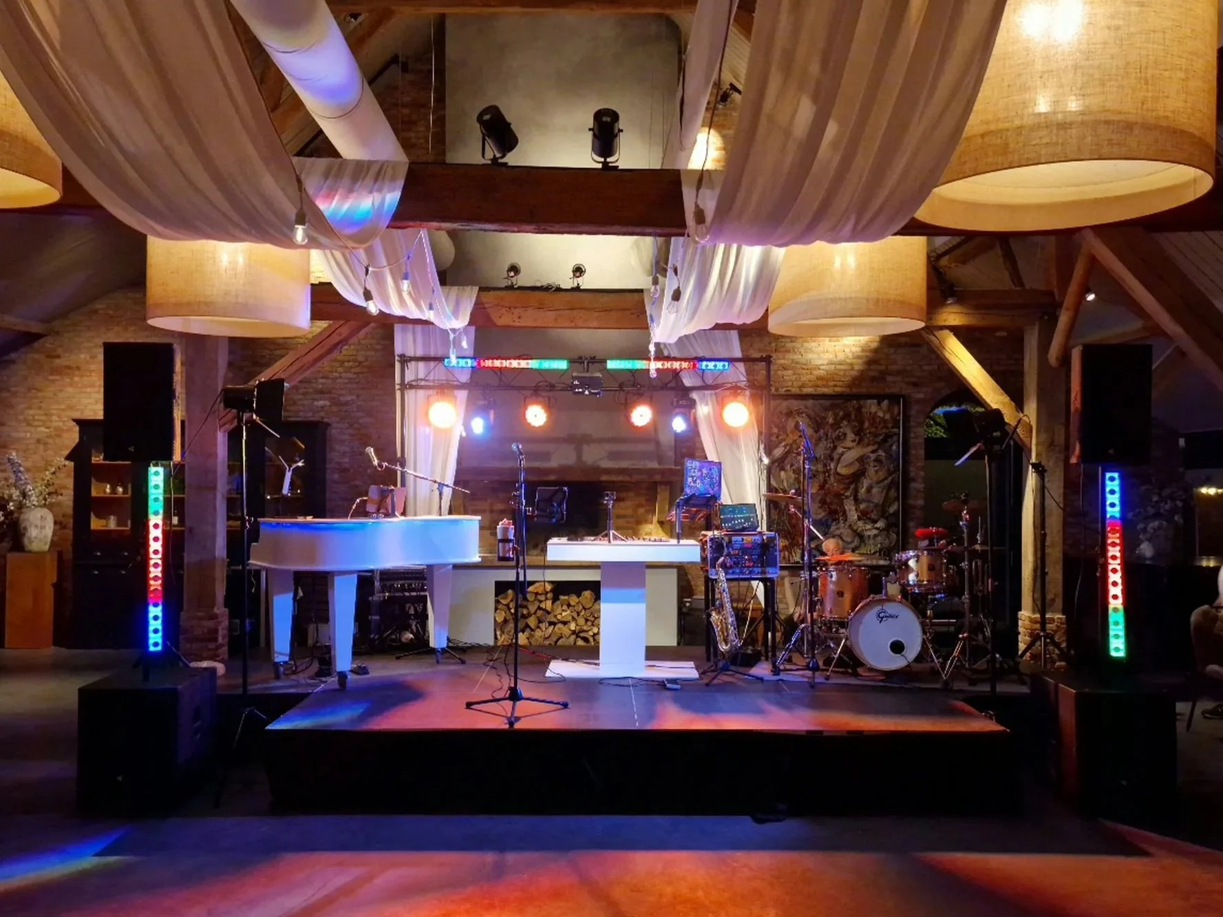 Lichtset (middel)- 2x statief met 2x 18x12W Led Par- LED verlichte piano- 2x 1 mtr truss met LED Movingheads 100W- Frontlight 100W LED- Speaker LED Buisverlichting- Rookmachine en lichtcomputer